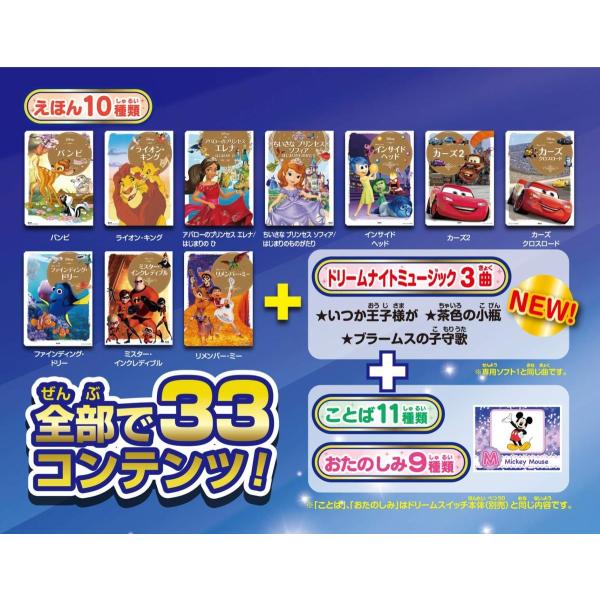 まとめ 寝かしつけが簡単に! ディズニーのプロジェクター ドリームスイッチが超おすすめです 出典:セガトイズ 子供を寝かしつけるために、布団に入って絵本を読み聞かせることがあると思いますが、ドリームスイッチは たくさんのディズニーの絵本 セガトイズは、絵本プロジェクター「ディズニー&ピクサーキャラクターズ Dream Switch2」を10月14日に発売する。価格は22,000円(税込)。 本商品はディズニー作品の絵本をプロジェクターで読み聞かせができる知育玩具。